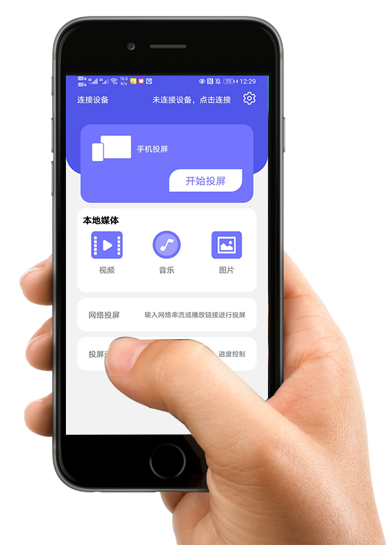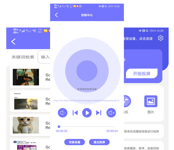 实时搜索周围设备,一键刷新,一键连接,点击图片、视频、音乐即可直接投屏播放